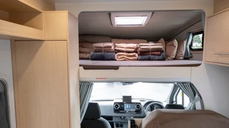 Die Ausstattung kann sich sehen lassen: großer Kühlschrank, Gasherd, Mikrowelle, Bad mit Dusche und WC. Die Sitzplätze verwandeln sich abends in zwei gemütliche Doppelbetten.